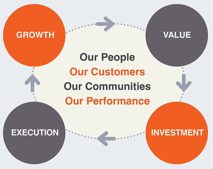 Our business model illustrates the links between our financial performance and other areas of our business. Each of the four components – growth, value, execution and investment – supports and leads into the next. When we succeed in growth, value and execution, we are able to continue to grow with our customers, our people and our communities.